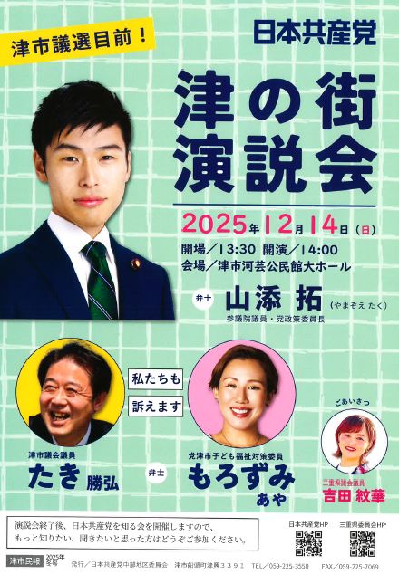 日本共産党三重県委員会は、12月14日午後から津市河芸公民館大ホールにて津の街演説会を開催します。